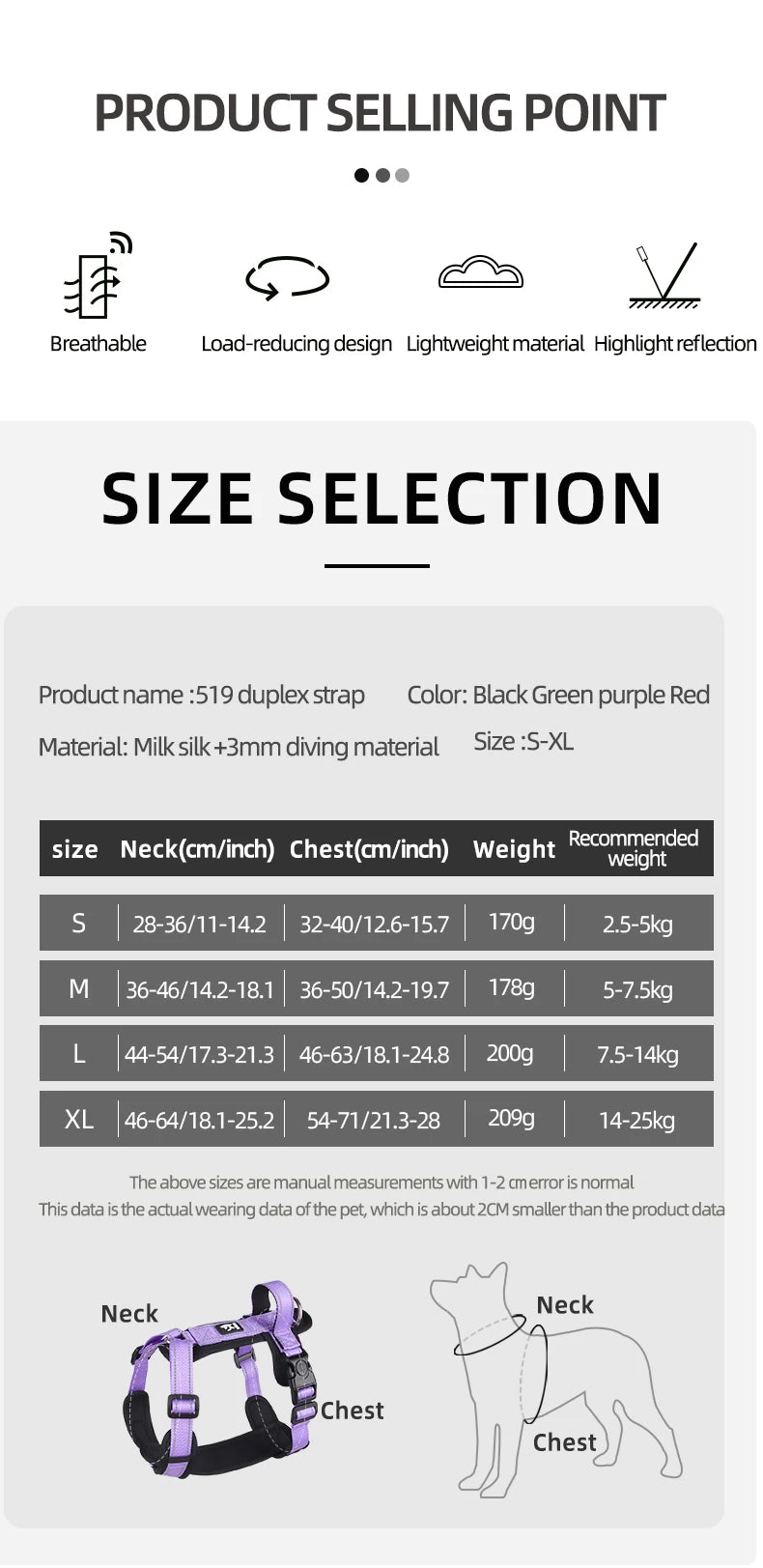 This explosion-proof dog harness is designed for small, medium, and large pets (3–50 kg). The front chest features 3 mm diving fabric, which is lightweight, comfortable, and reduces friction for safer wear. It includes a handle for extra control, 4-way adjustable straps to fit most dog sizes, and reflective tape for nighttime visibility. Made of durable polyester blends, it comes in Red, Black, Purple, and Green. Package includes 1 harness (leash not included). Perfect for all stages of your dog’s life.